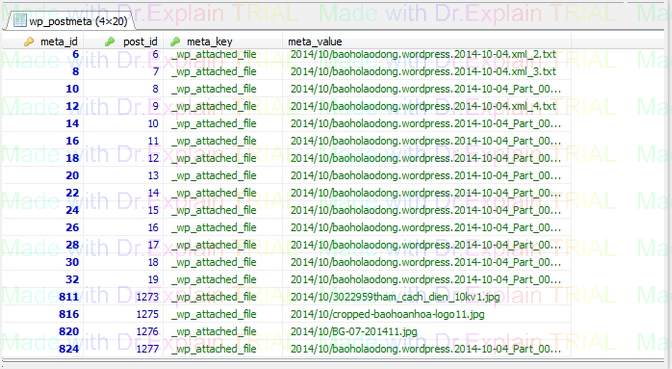 + Các file attachment được khai báo trong bảng wp_postmeta có meta_key='_wp_attached_file'.