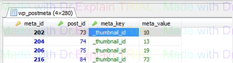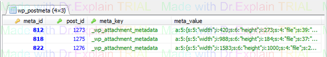 + Thông tin của các attachments xác định bởi meta_key='_wp_attachment_metadata' và giá trị là mảng đã được serialize lưu cùng bảng wp_postmeta.