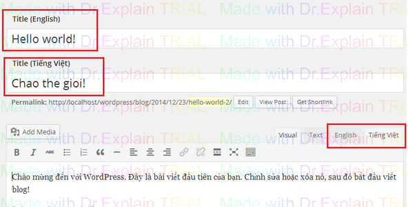 - Trong phần sửa nội dung title, content bài viết có từng ô ngôn ngữ để sửa, tuy nhiên URL slug thì cố định, nếu muốn thay đổi cả slug khi chuyển ngôn ngữ thì cài thêm plugin 'qTranslate slug'.