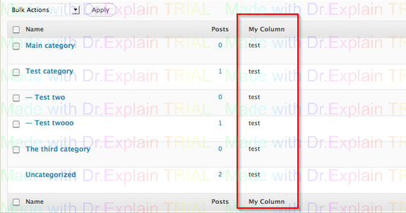 Tùy biến hiển thị trang liệt kê category bằng cách hiển thị thêm giá trị trường vào cột mới. Tạo hàm với hook thêm cột mới và hook còn lại để hiển thị giá trị của cột như sau: